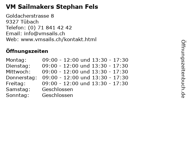 | Öffnungszeiten VM Sailmakers Stephan Fels in Tübach anzeigen | |