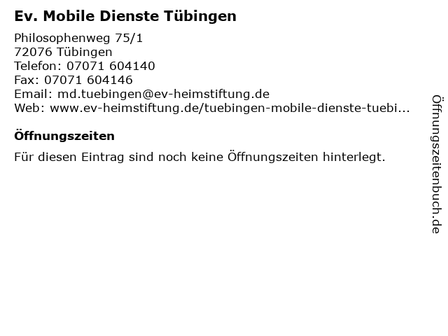 | Öffnungszeiten Ev. Mobile Dienste Tübingen in Tübingen anzeigen | |