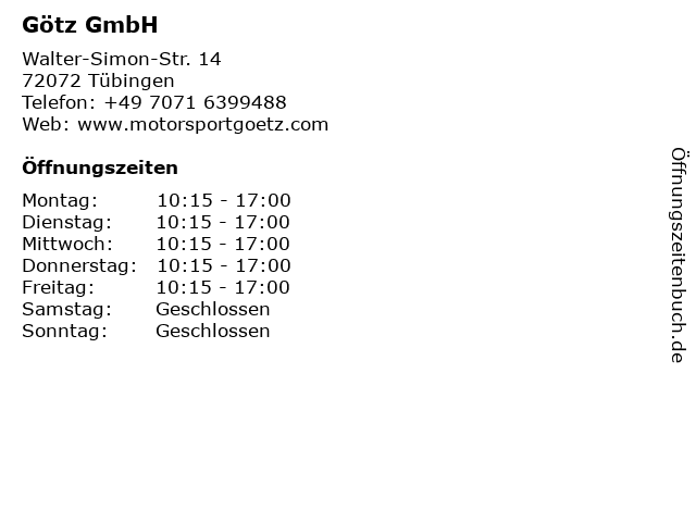 | Öffnungszeiten Götz GmbH in Tübingen anzeigen | |