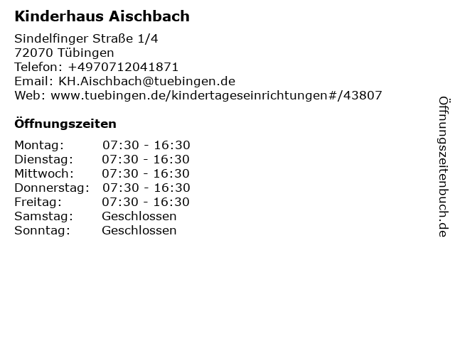 | Öffnungszeiten Kinderhaus Aischbach in Tübingen anzeigen | |