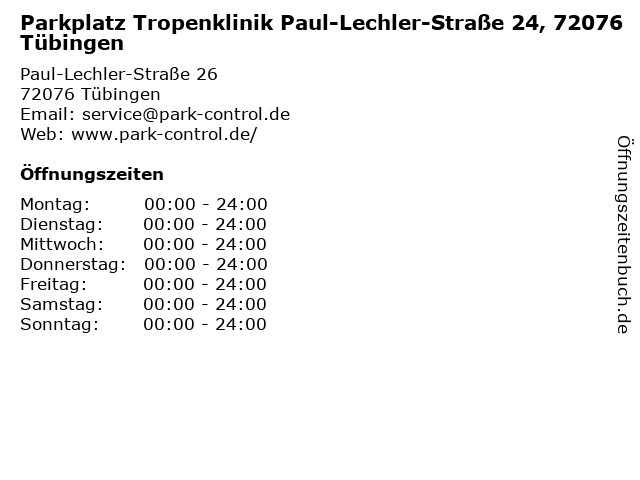 | Öffnungszeiten Parkplatz Tropenklinik Paul-Lechler-Straße 24, 72076 Tübingen in Tübingen anzeigen | |