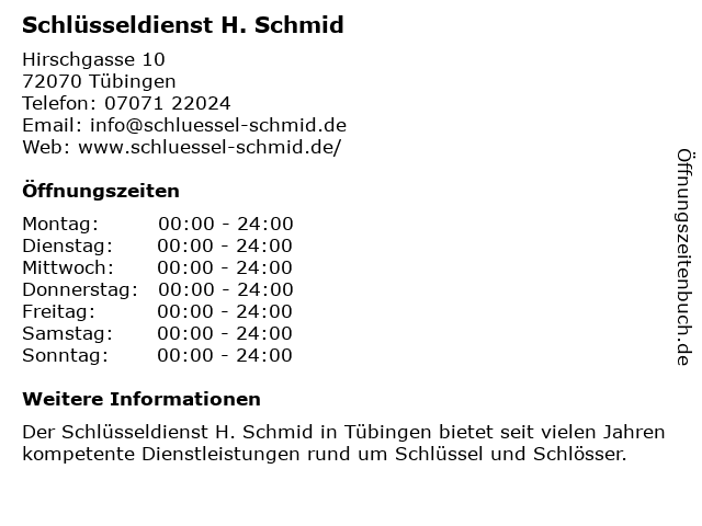| Öffnungszeiten Schlüsseldienst H. Schmid in Tübingen anzeigen | |