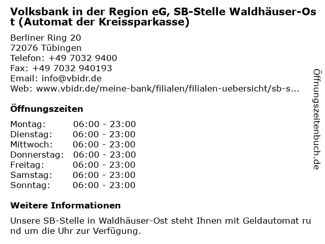 3 Volksbank Tübingen eG - Filiale Waldhäuser-Ost (Entfernung: 0,03 km) Berliner Ring 20, 72076 Tübingen 6 |