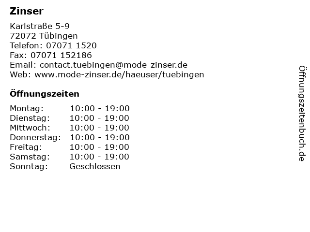 | Öffnungszeiten Zinser in Tübingen anzeigen | |