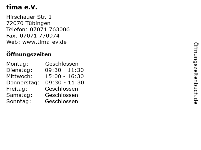 | Öffnungszeiten tima e.V. in Tübingen anzeigen | |