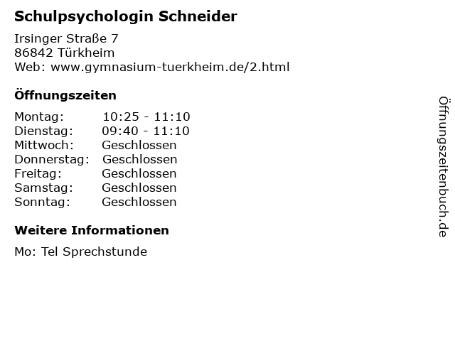 | Öffnungszeiten Schulpsychologin Schneider in Türkheim anzeigen | |