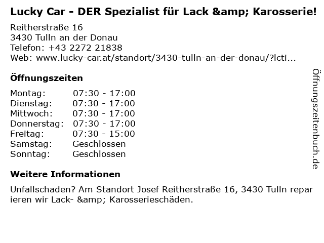 1 Lucky Car - DER Spezialist für Lack & Karosserie! (Entfernung: 16,72 km) Rudolf-Hirsch-Straße 3, 2000 Stockerau 2 Lucky Car - DER Spezialist für Lack & Karosserie! (Entfernung: 19,62 km) Holzhausenplatz 1, 1140 Wien 6 |