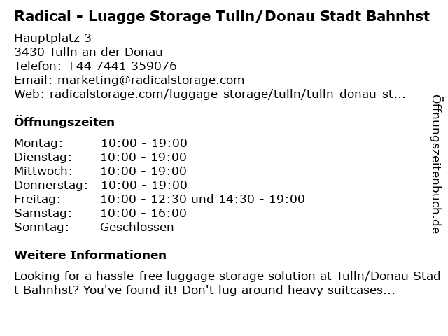 Branchen & Suchbegriffe zu Radical - Luagge Storage Tulln/Donau Stadt Bahnhst:bahnhst, luagge, luggage storage, luggage storage near me, radical, stadt, storage, tulln/donau |