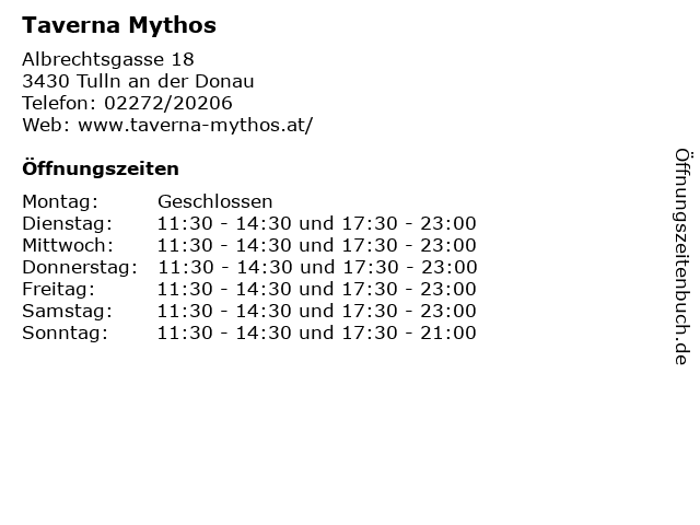 | Öffnungszeiten Taverna Mythos in Tulln an der Donau anzeigen | |
