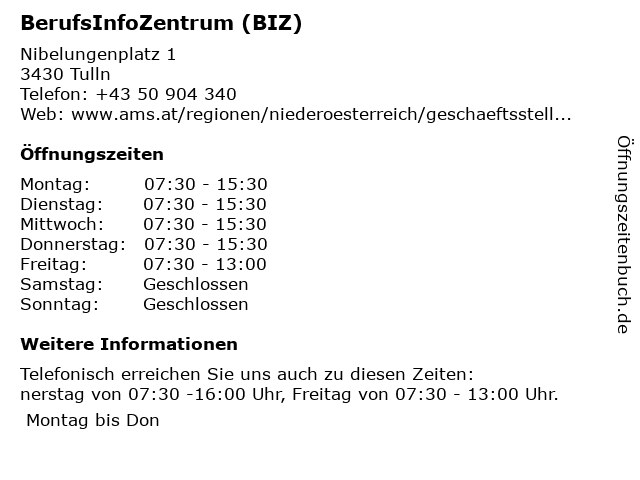 | Öffnungszeiten BerufsInfoZentrum (BIZ) in Tulln anzeigen | |