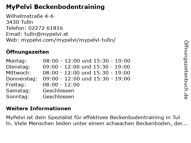 | Öffnungszeiten MyPelvi Beckenbodentraining in Tulln anzeigen | |