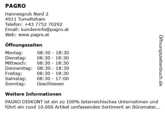| Öffnungszeiten PAGRO in Tumeltsham anzeigen | |