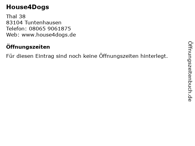 | Öffnungszeiten House4Dogs in Tuntenhausen anzeigen | |