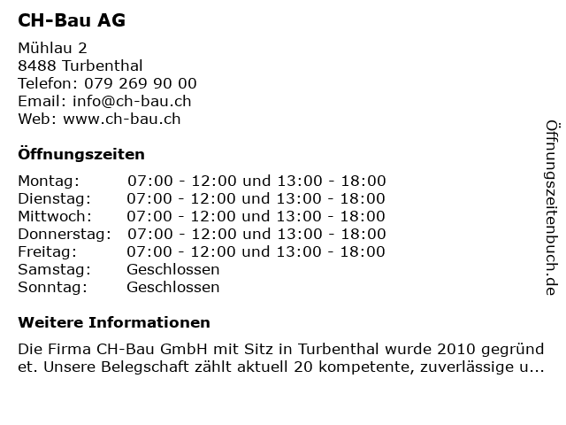 | Öffnungszeiten CH-Bau AG in Turbenthal anzeigen | |