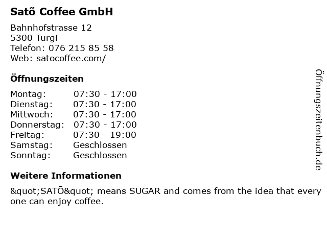 | Öffnungszeiten Satõ Coffee GmbH in Turgi anzeigen | |
