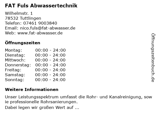 | Öffnungszeiten FAT Fuls Abwassertechnik in Tuttlingen anzeigen | |