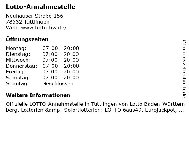 | Öffnungszeiten Lotto-Annahmestelle in Tuttlingen anzeigen | |