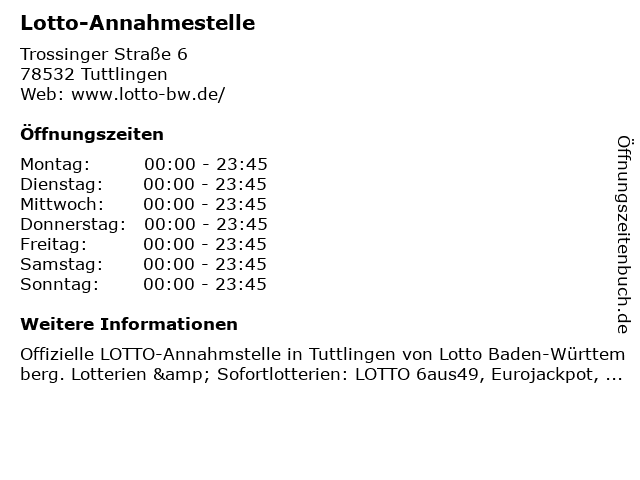 Öffnungszeiten Lotto-Annahmestelle in Tuttlingen anzeigen | |