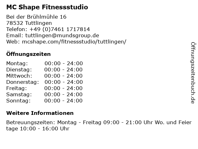 | Öffnungszeiten MC Shape Fitnessstudio in Tuttlingen anzeigen | |