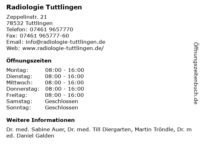 | Öffnungszeiten Radiologie Tuttlingen in Tuttlingen anzeigen | |