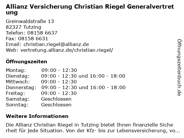 1 Allianz Versicherung Wolfgang Müller Generalvertretung (Entfernung: 0,02 km) Greinwaldstraße 13, 82327 Tutzing 2 Allianz Versicherung Pietro Tonetto Generalvertretung (Entfernung: 8,00 km) Am Weidach 15, 82396 Pähl 3 AXA Generalvertretung Bernhard Scherz (Entfernung: 11,14 km) Hans-Urmiller-Ring 17, 82515 Wolfratshausen 4 Allianz Versicherung Florian Braun Generalvertretung (Entfernung: 11,41 km) Am mühlberg 20, 82319 Starnberg 6 |