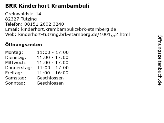 | Öffnungszeiten BRK Kinderhort Krambambuli in Tutzing anzeigen | |