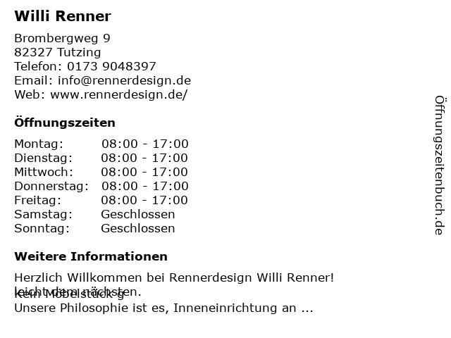 | Öffnungszeiten Willi Renner in Tutzing anzeigen | |