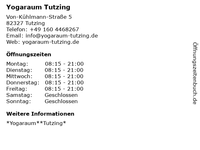 | Öffnungszeiten Yogaraum Tutzing in Tutzing anzeigen | |