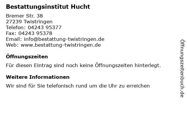 | Öffnungszeiten Bestattungsinstitut Hucht in Twistringen anzeigen | |