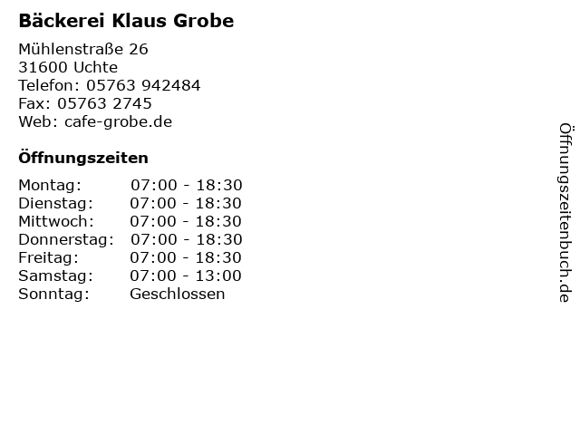 | Öffnungszeiten Bäckerei Klaus Grobe in Uchte anzeigen | |
