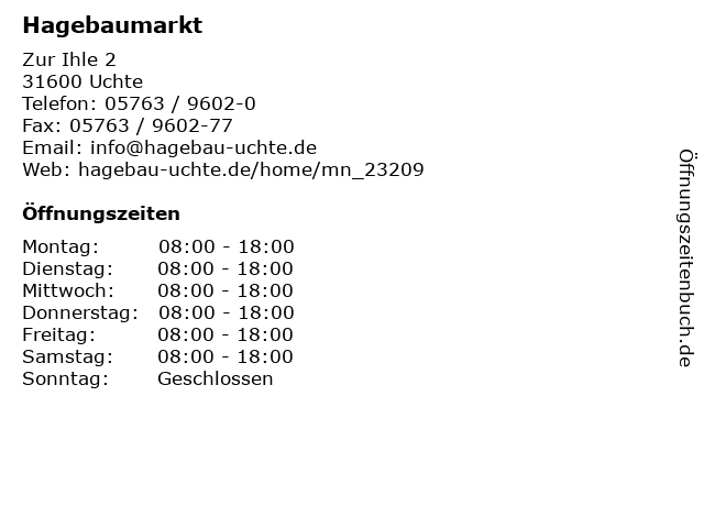 | Öffnungszeiten Hagebaumarkt in Uchte anzeigen | |