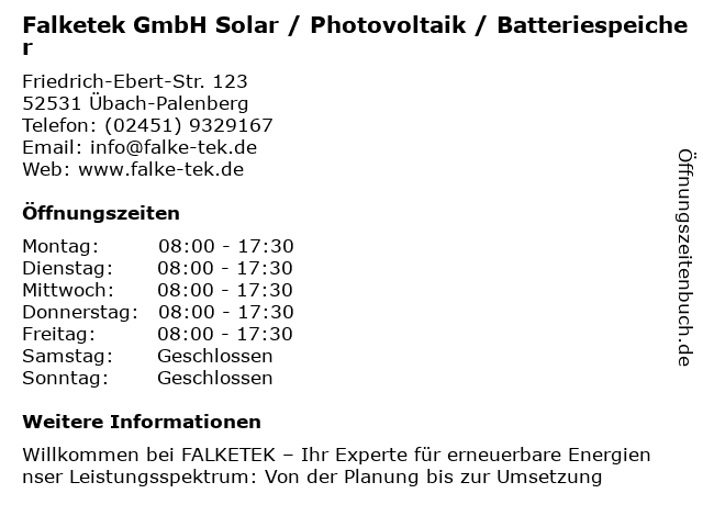 1 Falketek GmbH Elektromeisterbetrieb (Entfernung: 0,00 km) Friedrich-ebert-straße 123, 52531 Übach-Palenberg 4 Toni Rodriguez Heizung Sanitär Solar Meisterbetrieb (Entfernung: 5,77 km) Claude-Monet-Ring 21, 52499 Baesweiler 6 Aktion Solar-Check Ralf Salber, Euregio - Rund um Aachen (Entfernung: 9,76 km) Barbarastraße 11A, 52477 Alsdorf |