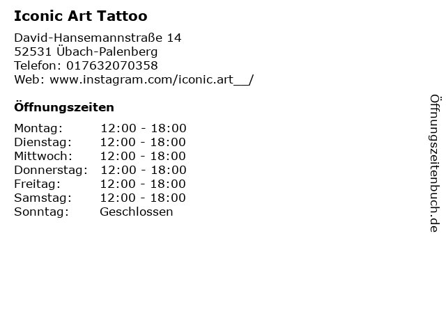 | Öffnungszeiten Iconic Art Tattoo in Übach-Palenberg anzeigen | |