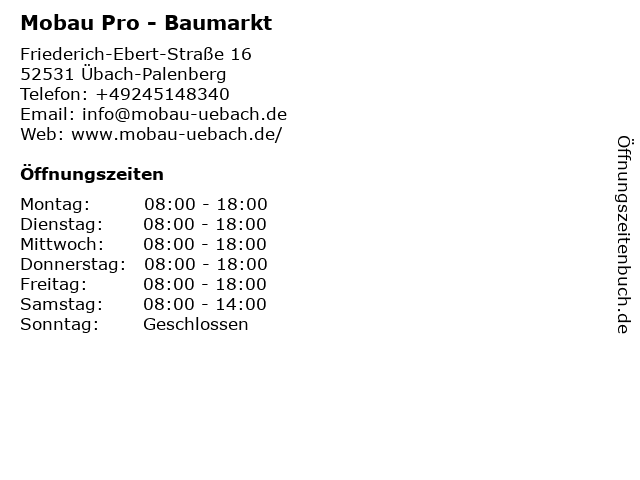 | Öffnungszeiten Mobau Pro - Baumarkt in Übach-Palenberg anzeigen | |