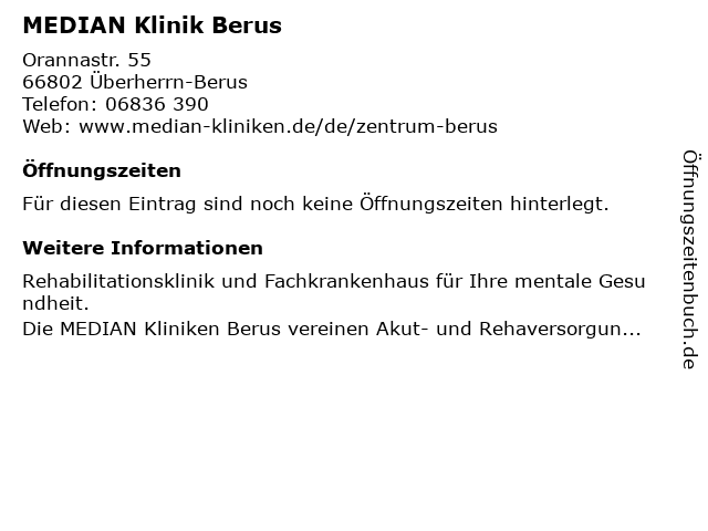 | Öffnungszeiten MEDIAN Klinik Berus in Überherrn-Berus anzeigen | |