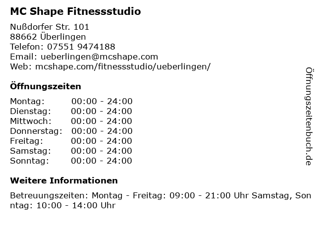 | Öffnungszeiten MC Shape Fitnessstudio in Überlingen anzeigen | |