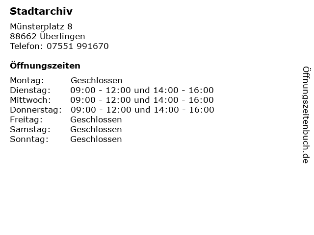 | Öffnungszeiten Stadtarchiv in Überlingen anzeigen | |