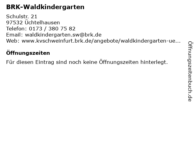 | Öffnungszeiten BRK-Waldkindergarten in Üchtelhausen anzeigen | |