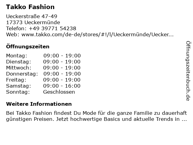 | Öffnungszeiten Takko Fashion in Ueckermünde anzeigen | |