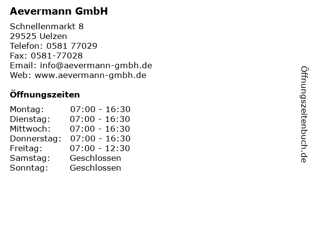 | Öffnungszeiten Aevermann GmbH in Uelzen anzeigen | |