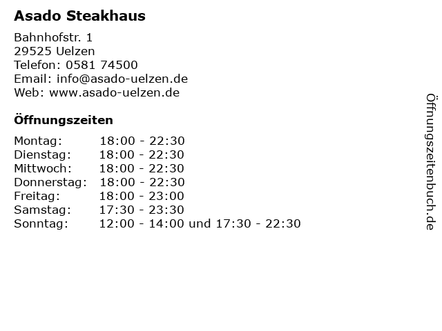 | Öffnungszeiten Asado Steakhaus in Uelzen anzeigen | |
