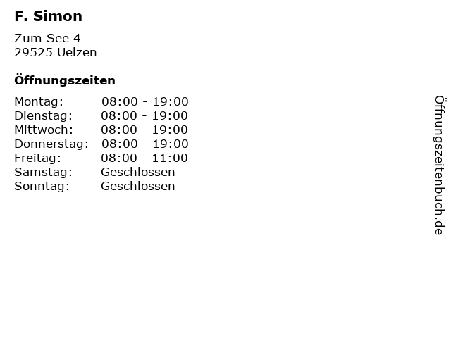 | Öffnungszeiten F. Simon in Uelzen anzeigen | |