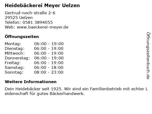 | Öffnungszeiten Heidebäckerei Meyer Uelzen in Uelzen anzeigen | |
