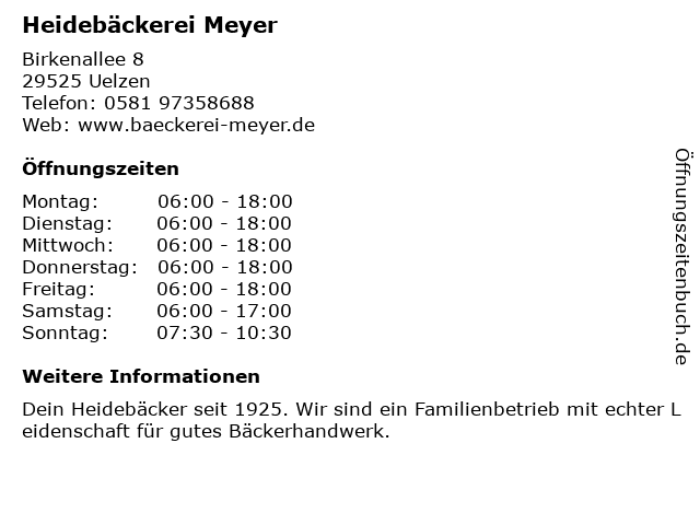 | Öffnungszeiten Heidebäckerei Meyer in Uelzen anzeigen | |