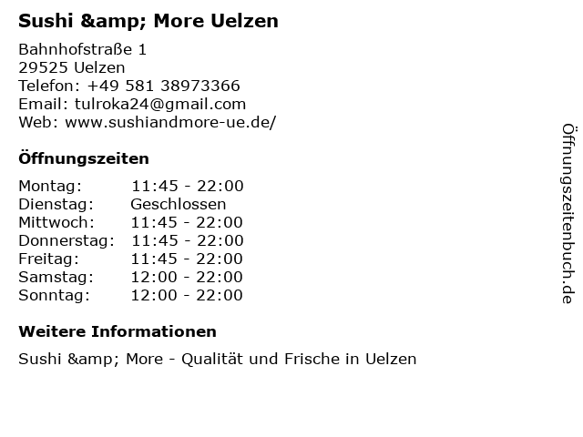 | Öffnungszeiten Sushi & More Uelzen in Uelzen anzeigen | |