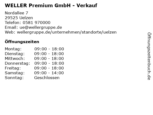| Öffnungszeiten WELLER Premium GmbH - Verkauf in Uelzen anzeigen | |