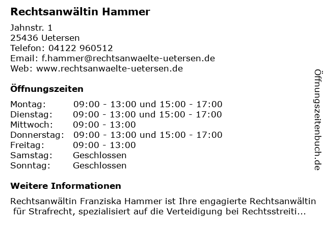 | Öffnungszeiten Rechtsanwältin Hammer in Uetersen anzeigen | |