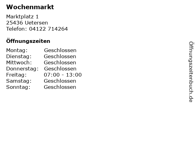 | Öffnungszeiten Wochenmarkt in Uetersen anzeigen | |