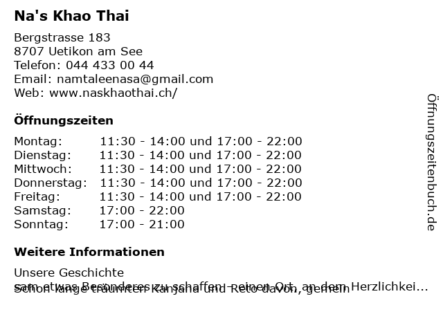 Öffnungszeiten Na's Khao Thai in Uetikon am See anzeigen | |