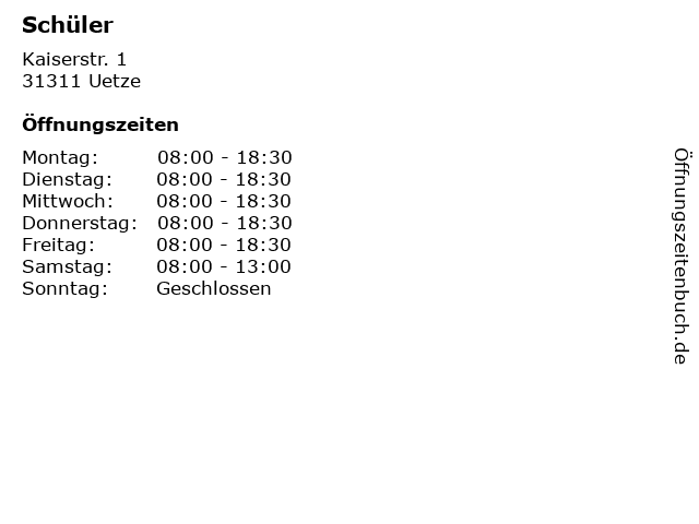 | Öffnungszeiten Schüler in Uetze anzeigen | |